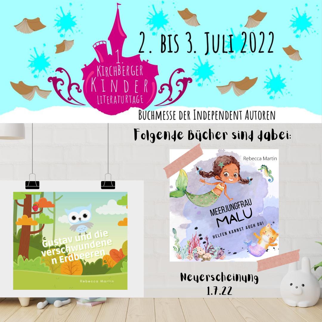 Ich bin mit meinen Büchern "Gustav und die verschwundenen Erdbeeren" und "Meerjungfrau Malu - Helfen kannst auch Du" am Sonntag, den 03.07.2022 mit dabei! "Meerjungfrau Malu - Helfen kannst auch Du" feiert dort seine Veröffentlichung.