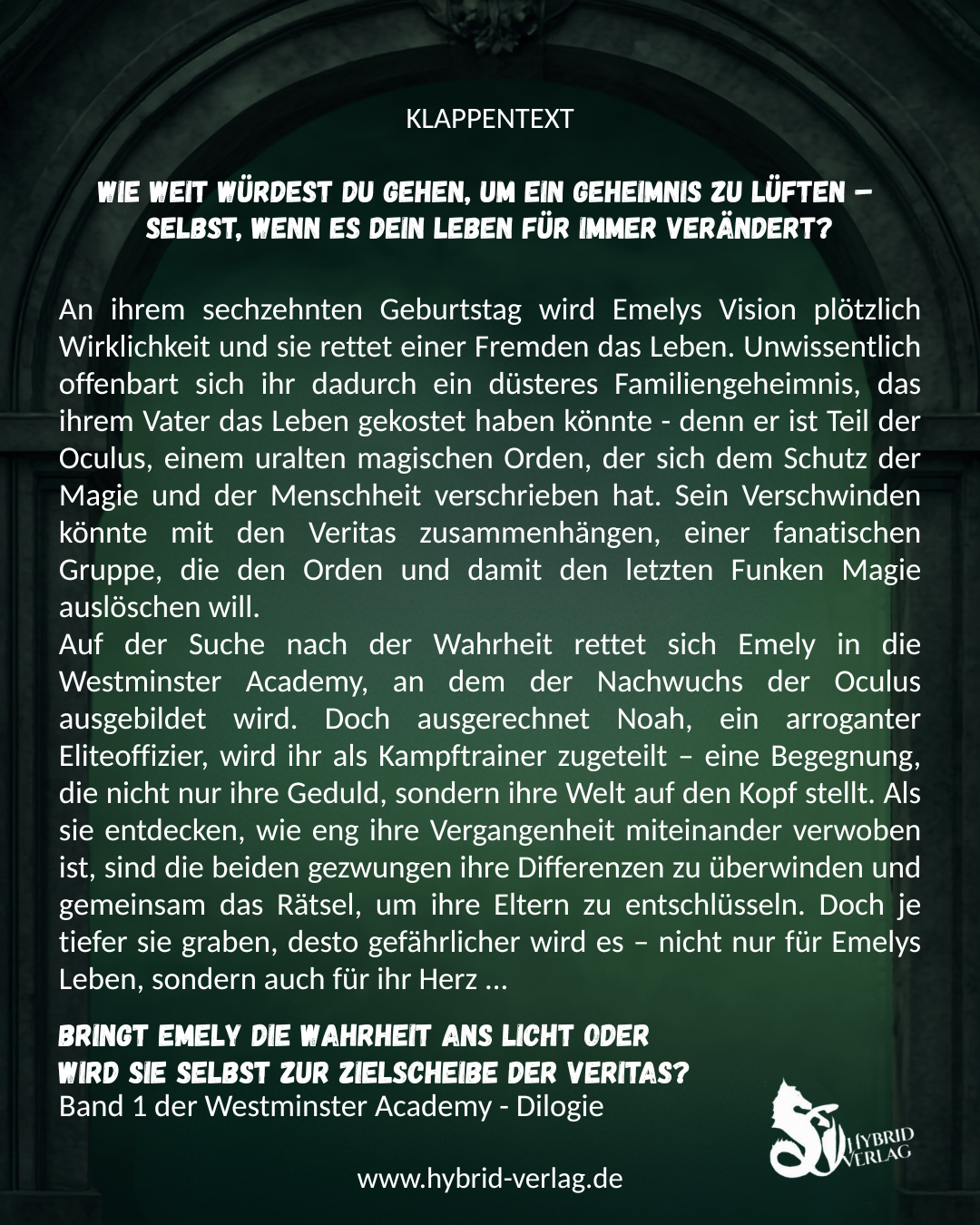 Auf der Suche nach der Wahrheit rettet sie sich an die Westminster Academy, an der der Nachwuchs der Oculus, einem jahrhundertealten magischen Orden, ausgebildet wird. Dort trifft sie auf Noah, den arroganten Eliteoffizier, der sie bis aufs Blut provoziert, und trotzdem scheint ihr Schicksal miteinander verwoben zu sein. Gemeinsam müssen sie die Wahrheit über ihre Eltern entschlüsseln – doch je tiefer sie graben, desto riskanter wird es.